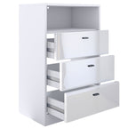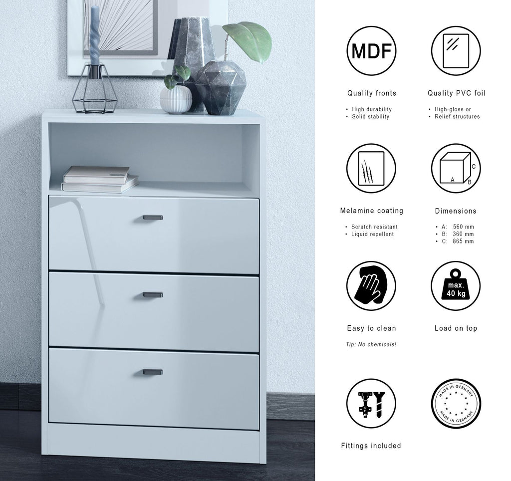 Durch das schlichte, moderne Design lässt sich die Kommode mit vielen verschiedenen Einrichtungsstilen kombinieren und sowohl als Wohnzimmerschrank, Kommode im Schlafzimmer oder als Präsentationsfläche für Deko-Objekte einsetzen. Für eine besondere Eleganz sorgen die Fronten der Schubladenkommode, erhältlich in vielen verschiedenen Farbvarianten, die Ihnen eine Vielzahl an Kombinationsmöglichkeiten bieten. Durch die Oberflächenbeschichtung erhalten Sie ein besonders pflegeleichtes Produkt. Für die Reinigung können Sie auf Chemie verzichten - es reicht ein leicht angefeuchtetes Tuch, um die wasserfeste Oberfläche angemessen zu reinigen.