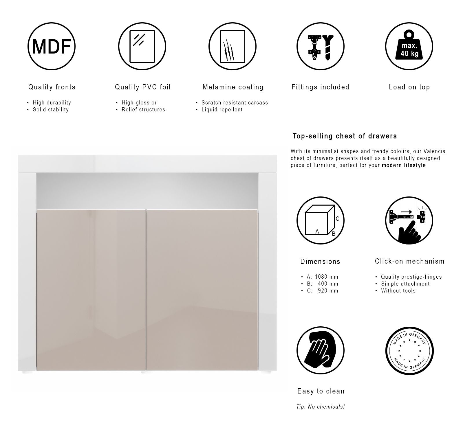 Durch das schlichte, moderne Design lässt sich die Kommode mit vielen verschiedenen Einrichtungsstilen kombinieren und sowohl als Wohnzimmerschrank, Kommode im Schlafzimmer oder als TV-Sideboard einsetzen. Für eine besondere Eleganz sorgen neben der Rahmenoptik, die Fronten der Kommode, erhältlich in vielen verschiedenen Farbvarianten, die Ihnen eine Vielzahl an Kombinationsmöglichkeiten bieten. Durch die Oberflächenbeschichtung erhalten Sie ein besonders pflegeleichtes Produkt. Für die Reinigung können Sie auf Chemie verzichten - es reicht ein leicht angefeuchtetes Tuch, um die wasserfeste Oberfläche angemessen zu reinigen.