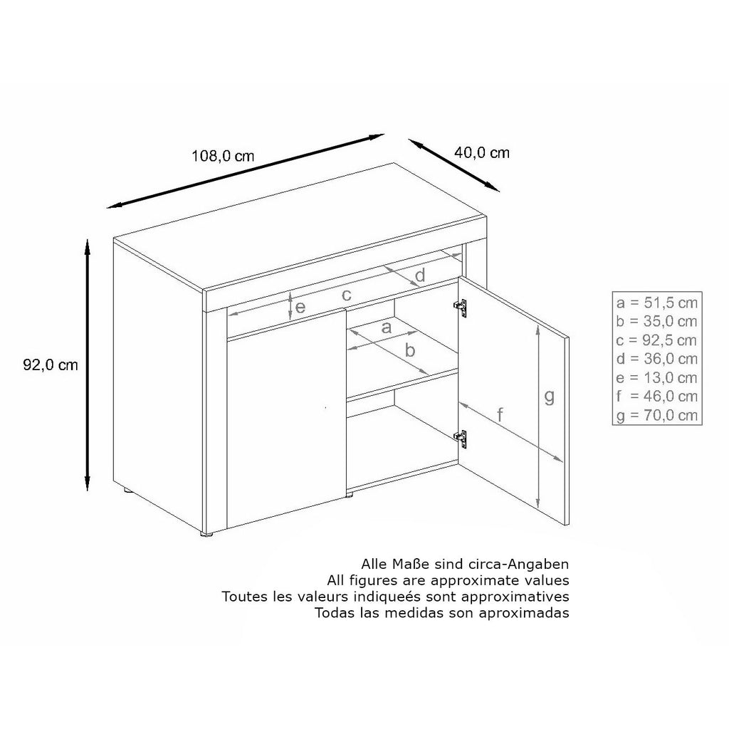 Ob als modernes Sideboard im Wohnzimmer, Kommodenschrank für's Schlafzimmer, Anrichte im Flur oder als Kommode im Kinderzimmer - die geräumige Kommode Girona präsentiert sich als praktisches Möbelstück mit einer markanten Rahmenverkleidung, hergestellt in Deutschland. Der Beistellschrank ist mit zwei großen Türen und einem durchgehenden, offenen Fach ausgerüstet. Hinter den Türen befinden sich jeweils zwei geräumige Fächer mit Einlegeboden. Die Türen lassen sich ganz bequem durch praktische Überstände öffnen. Eine Rückwand in Holzoptik aus Hartfaserplatten ist im Lieferumfang enthalten.