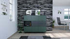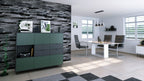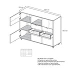 In der oberen und unteren Reihe befinden sich jeweils drei Türen mit Push-to-Open-Funktion, die sechs geschlossene Fächer verbergen – ideal als Kommode, Schrank oder Aufbewahrungsschrank. Auf der linken Seite befindet sich ein offenes Fach für Bücher, Deko oder Technik. Daneben bieten vier praktische Schubladen mit schwarzen Metallgriffen zusätzlichen Stauraum – perfekt für Alltagsutensilien, Dokumente oder Besteck.