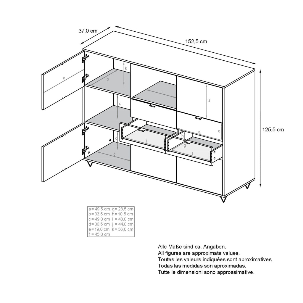 Lieferumfang: 1x Highboard, Montagematerial & bebilderte Aufbauanleitung