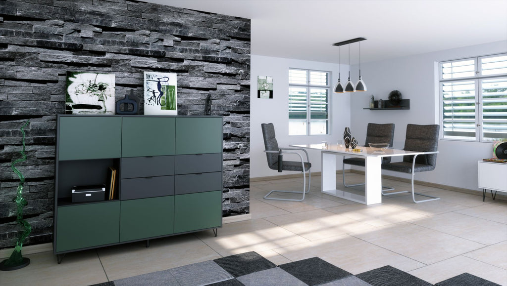 Gefertigt aus melaminbeschichteter Spanplatte überzeugt das Highboard mit Stabilität, Langlebigkeit und Pflegeleichtigkeit – Qualität Made in Germany. Ob als Highboard, Sideboard oder Bücherregal – Mirano passt in jedes Zuhause.