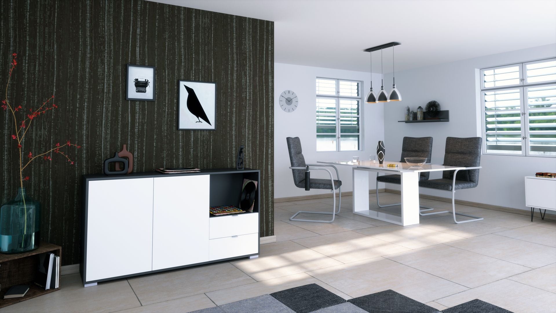Das Sideboard Mirallo vereint modernes Design mit cleverem Stauraum. Der Korpus in Anthrazit verleiht dem Möbelstück eine zeitlose, elegante Ausstrahlung. Silberne Füße sorgen für Stabilität und dezente Akzente. Die Frontfarbe ist individuell wählbar – ideal für Wohnzimmer, Schlafzimmer, Esszimmer oder Flur.