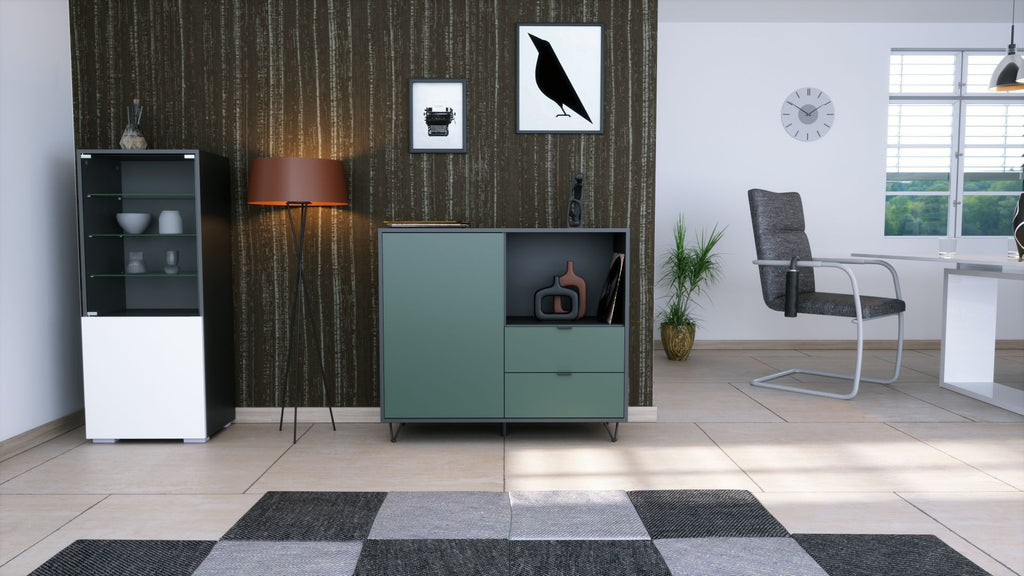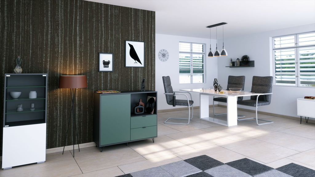 Die Mirano Kommode verbindet modernes Design mit durchdachtem Stauraum. Der Korpus in Anthrazit matt verleiht dem Möbelstück eine zeitlose und elegante Ausstrahlung. Schwarze Füße sorgen für Stabilität und setzen moderne Akzente. Die Frontfarbe ist individuell wählbar – perfekt für Wohnzimmer, Schlafzimmer, Esszimmer oder Flur.