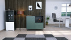 Hinter der einzigen Tür mit Push-to-Open-Funktion verbergen sich zwei praktische Innenfächer – ideal als Kommode, Schrank oder Aufbewahrungsschrank für Haushaltsgegenstände, Deko oder Geschirr. Auf der rechten Seite befindet sich ein offenes Fach, das sich ideal für Dekoration, Pflanzen oder Technik eignet. Direkt darunter liegen zwei geräumige Schubladen mit eleganten schwarzen Metallgriffen, die viel Platz für Kleinteile, Besteck oder Dokumente bieten.