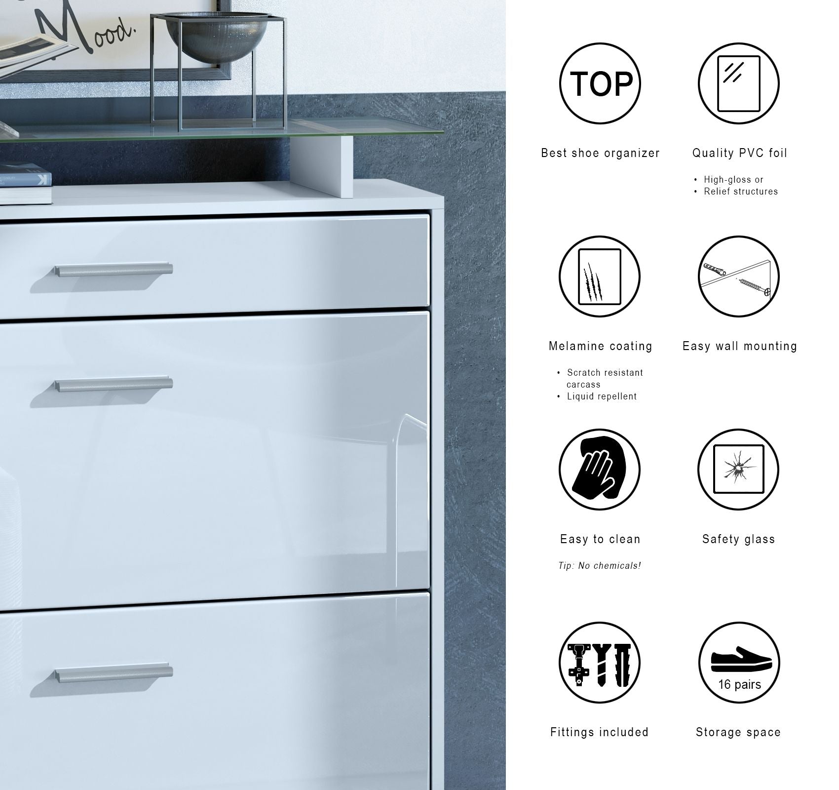Durch das schlichte, moderne Design lässt sich das schmale Schuhregal mit vielen verschiedenen Einrichtungsstilen kombinieren. Für eine besondere Eleganz sorgen die Fronten des Schuhkippers, erhältlich in vielen verschiedenen Farbvarianten, die Ihnen eine Vielzahl an Kombinationsmöglichkeiten bieten. Durch die Oberflächenbeschichtung erhalten Sie ein besonders pflegeleichtes Produkt. Für die Reinigung können Sie auf Chemie verzichten - es reicht ein leicht angefeuchtetes Tuch, um die wasserfeste Oberfläche angemessen zu reinigen.