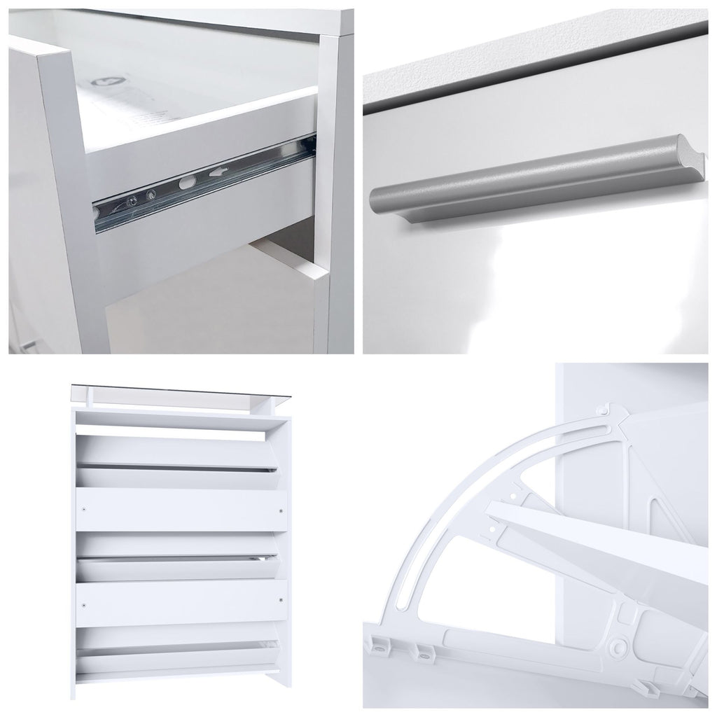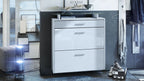 Das hängende Schuhschregal Ljusdal präsentiert sich als praktisches Möbelstück mit modernem Design für die Diele, hergestellt in Deutschland. Der schmale Schuhschrank ist mit zwei Schuhkippern mit doppelten Schuhhalterungen und mit einer leichtgängigen Schublade ausgerüstet. Diese verläuft dank Laufschienen aus Metall nahezu geräuschlos und sorgt für eine leichte Handhabung. Der Schuhorganizer ist mit dezenten, silbernen Griffen ausgestattet. Zusätzlich gibt es eine aufgesetzte Glasablage für das Schuhregal. Mit dem inkludierten Material zur Wandmontage fixieren Sie den Schuhschrank hängend an der Wand.
