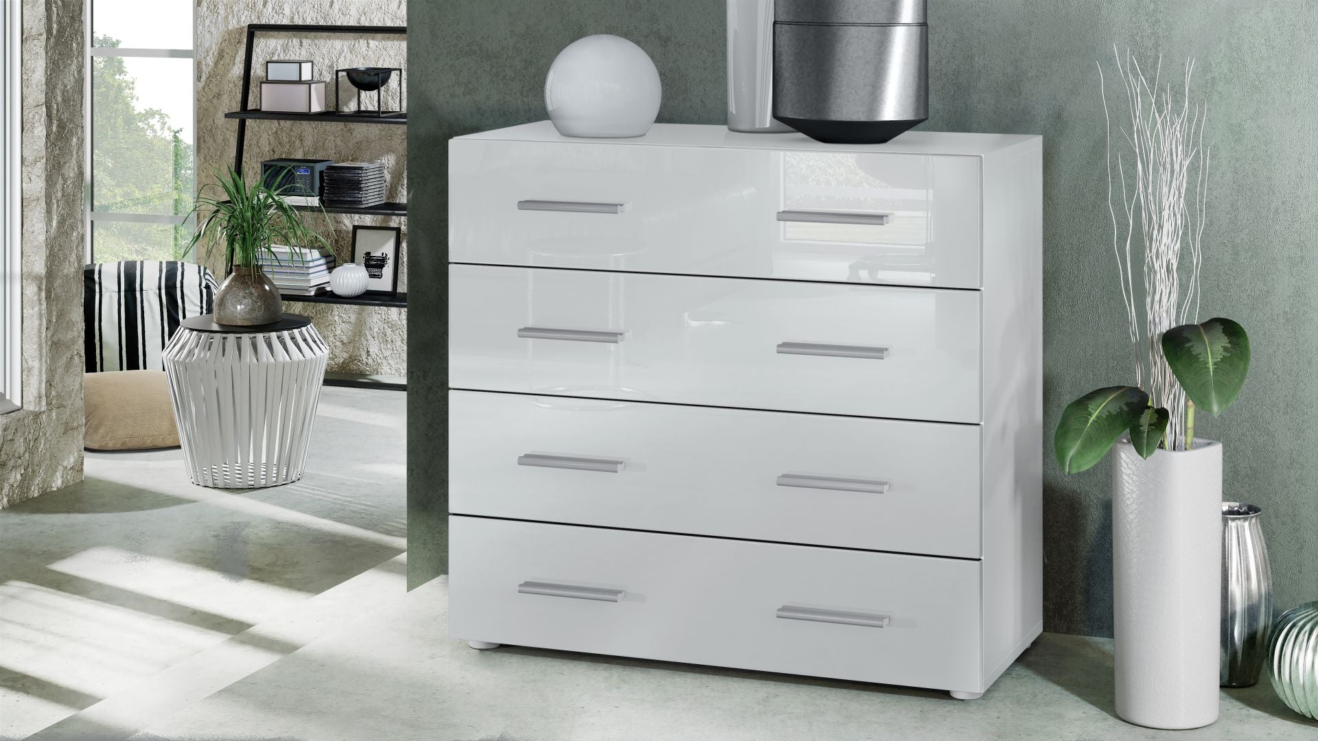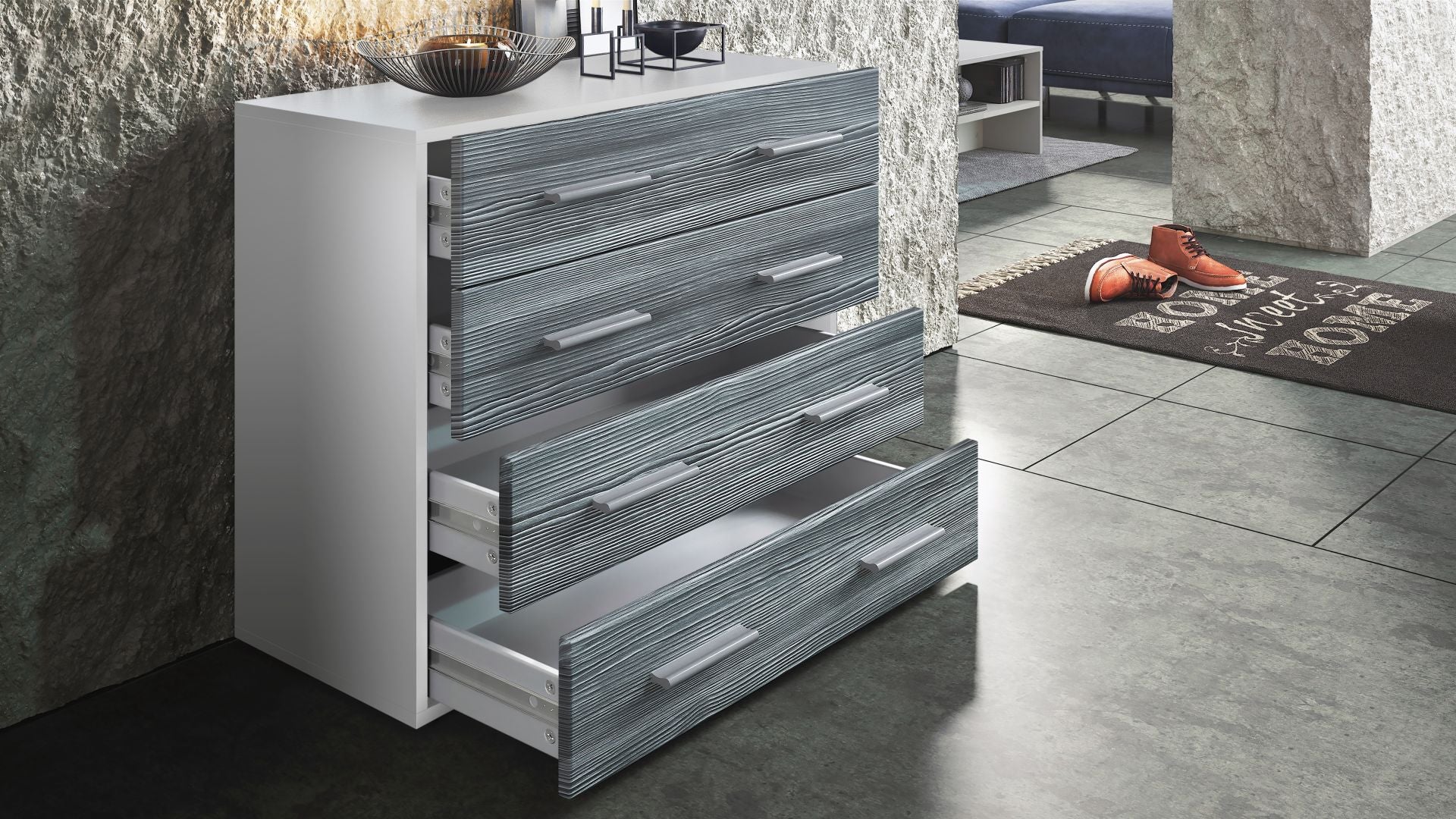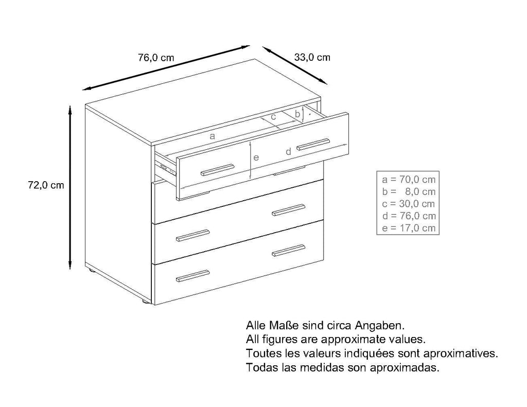 Ob als modernes Sideboard im Wohnzimmer, Kommodenschrank für's Schlafzimmer, Anrichte im Flur oder als Kommode im Kinderzimmer - die geräumige Kommode Lugano präsentiert sich als praktisches Möbelstück mit modernem Design, hergestellt in Deutschland. Der Beistellschrank ist mit vier leichtgängigen Schubladen ausgerüstet. Diese verlaufen dank Laufschienen aus Metall nahezu geräuschlos und sorgen für eine leichte Handhabung. Die Schubladen sind mit dezenten, silbernen Griffen ausgestattet. Eine Rückwand in Holzoptik aus Hartfaserplatten ist im Lieferumfang enthalten.