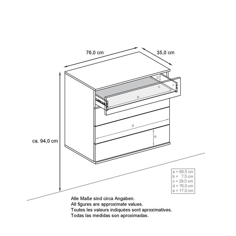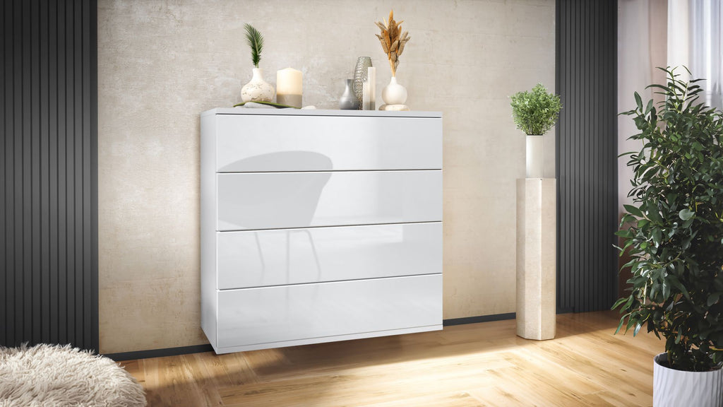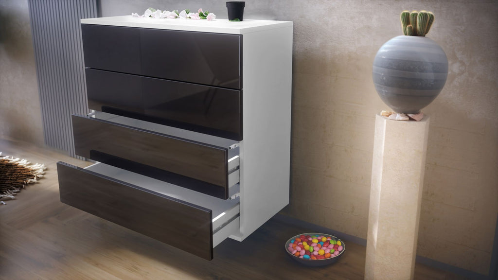 Ob als modernes Sideboard im Wohnzimmer, Kommodenschrank für's Schlafzimmer, Anrichte im Flur oder als Kommode im Kinderzimmer - die geräumige und schwebende Kommode Lugano M3 präsentiert sich als praktisches Möbelstück mit modernem Design, hergestellt in Deutschland. Der Beistellschrank verfügt über vier leichtgängige Schubladen, die sich dank des innovativen Push-to-Open-Systems mühelos durch einen einfachen Druck öffnen lassen. Die Schubladen gleiten nahezu geräuschlos auf stabilen Metallschienen, was eine besonders komfortable Nutzung gewährleistet. Eine Rückwand in Holzoptik aus Hartfaserplatten ist im Lieferumfang enthalten.