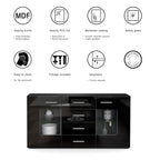 Die innenliegenden Schubkästen des Sideboards gleiten sanft und leise auf Metalllaufschienen, sodass Sie Ihre Lieblingsstücke übersichtlich organisieren können. Die beiden Vitrinentüren sind mit Glaseinlegeböden ausgestattet, die dem Möbelstück eine besonders elegante Optik verleihen und Ihre Dekorationsgegenstände stilvoll zur Schau stellen.