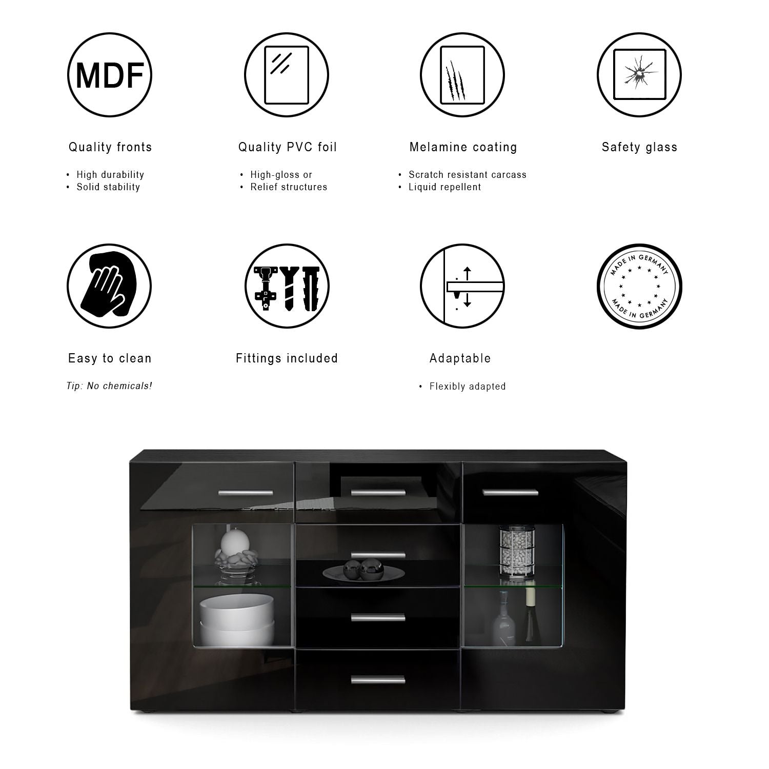 Die silberfarbenen Kunststoffgriffe setzen edle Akzente und harmonieren hervorragend mit dem Gesamtdesign des Sideboards Lugo. Dank des hochwertigen Metall-Montagezubehörs ist eine stabile und dauerhafte Montage gewährleistet. Die bebilderte Aufbauanleitung führt Sie Schritt für Schritt durch den Aufbau, während die Schubkästen dank Teleskopschienen aus Metall eine zuverlässige Stabilität bieten.