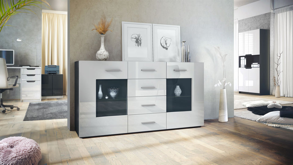 Entdecken Sie das elegante und geräumige Sideboard Lugo - Perfekte Fusion von Vitrinenoptik und Funktionalität