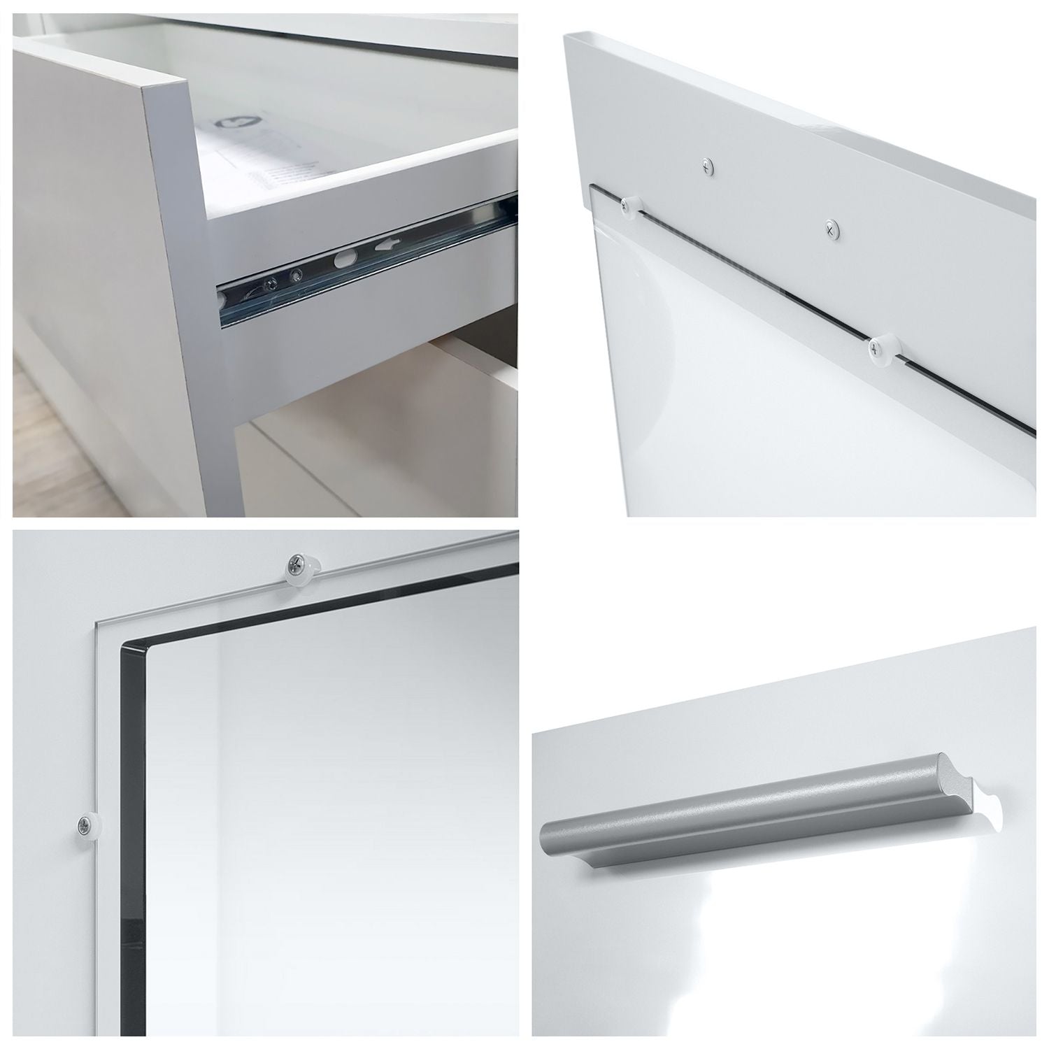 Die Griffe bestehen aus silberfarbenem Kunststoff. Das Montagezubehör ist aus Metall und sorgt für eine stabile Montage. Eine einfache, bebilderte Aufbauanleitung bietet reichlich Unterstützung bei der Selbstmontage. Für Stabilität und Ausdauer laufen die Schubkästen auf Teleskopschienen aus Metall.