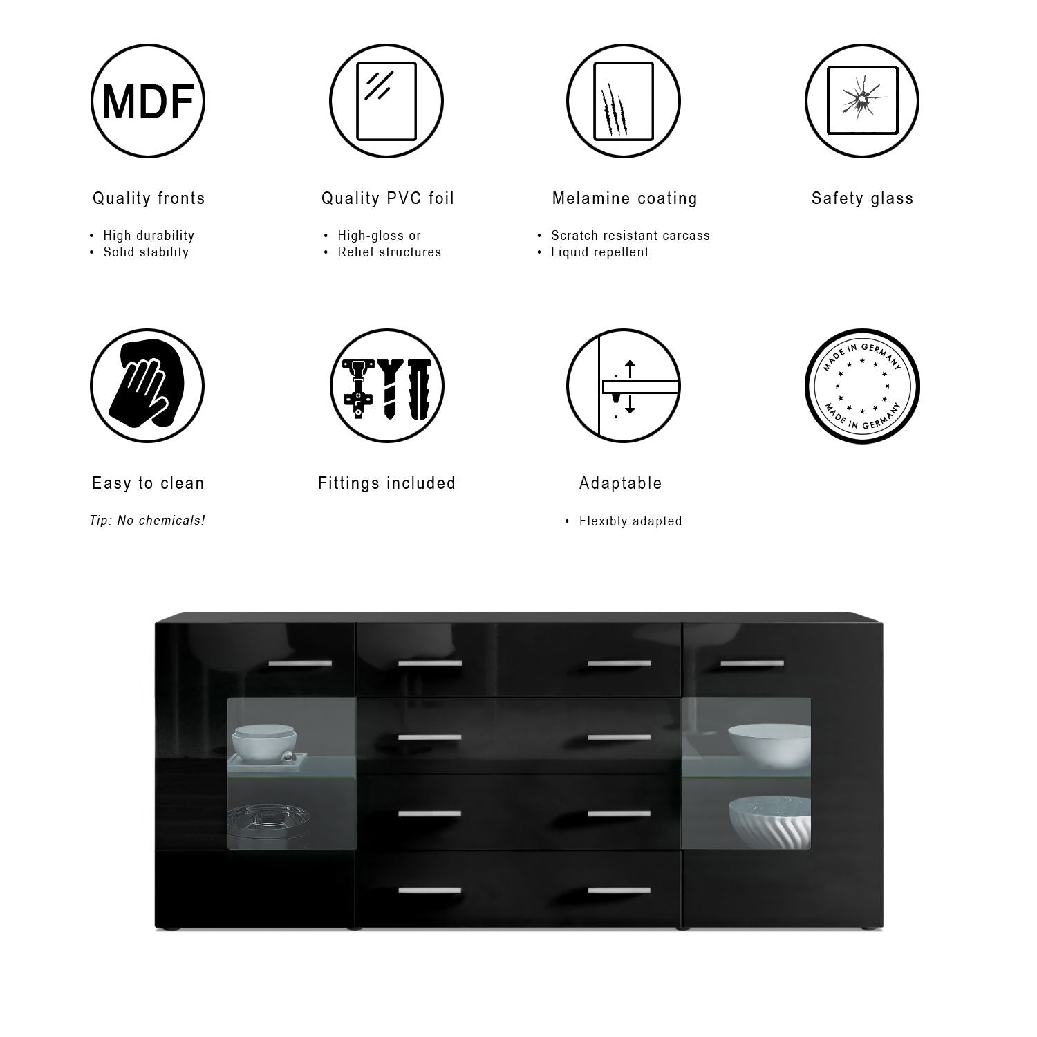 Das Sideboard hat einen matten, melamin-beschichteten, Korpus in einem eleganten Schwarz (mit feiner Holzstruktur). Die Fronten bestehen aus MDF und sind entweder in Hochglanz oder mit naturrealistischer Maserung, jeweils mit abgerundeten Kanten (besonders wichtig für die Sicherheit von Kindern usw.) verfügbar. Die naturrealistischen Oberflächen der Farben Avola-Champagner, Avola-Anthrazit, Eiche sägerau und Mali-Wenge weisen eine feine Reliefstruktur auf.