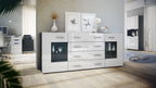 In dem Sideboard Lugo M2 verschmilzt eine ansprechende Vitrinenoptik mit praktischen Aufbewahrungsmöglichkeiten zu einer aufregenden Gesamterscheinung. Dieses Designer Möbel verzichtet dennoch nicht auf Stauraum und Funktionalität. Hier wurde ein perfekter Kompromiss aus Vitrine und Kommode getroffen, wie er nur selten zu finden ist. Die innenliegenden Schubkästen laufen auf lautlosen Metalllaufschienen und sichern Ihnen die Möglichkeit eine übersichtliche Lagerung Ihrer Lieblingsstücke zu verwirklichen. 2 Glaseinlegeböden hinter den Vitrinentüren verfeinern diese elegante Optik um ein Vielfaches. Mit der optionalen LED-Beleuchtung können Sie Ihre Lieblingsstücke so sprichwörtlich ins rechte Licht rücken.