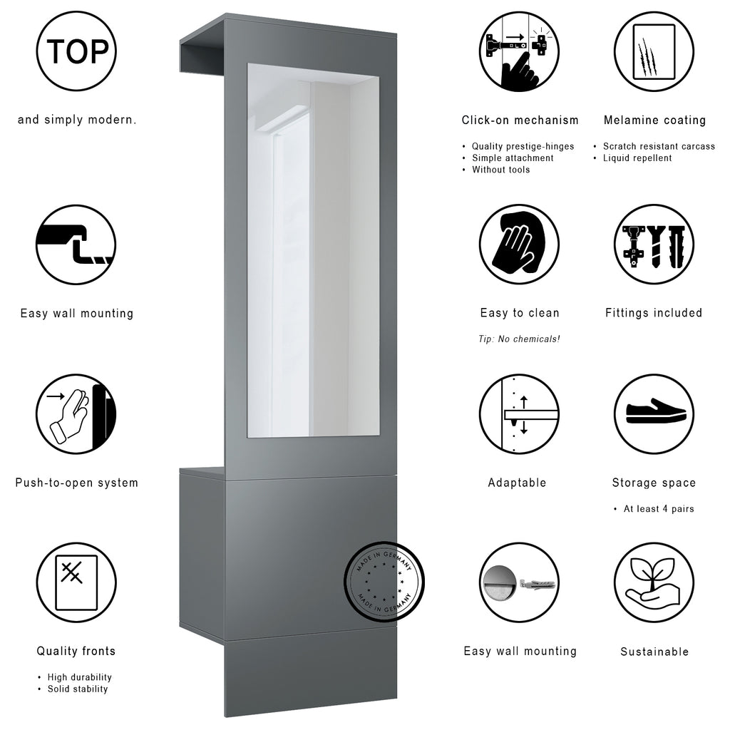 Die Garderobe Lulea Neo besteht aus einem Wandpaneel mit Spiegel, integrierter Tür, dahinter ein praktisches Fach mit einem Einlegeboden und eine Kleiderstange zum Aufhängen von Kleiderbügeln, hergestellt in Deutschland. Die Tür der grifflosen Wandgarderobe ist mit dem Push-to-Open System ausgestattet. Das Fach hinter der Tür kann mit einem höhenverstellbaren Einlegeboden ganz individuell in zwei Fächer unterteilt werden oder bei Bedarf auch als ein großes Fach genutzt werden. Die Kleiderstange hinter dem Paneel ist aus Edelstahl gefertigt und sorgt dafür, dass Sie Ihre Jacken und Mäntel gut verstauen können.