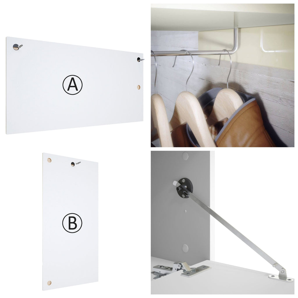 Die Garderobe Lulea Set 4 besteht aus einem Wandpaneel mit integrierter Tür, dahinter ein Fach mit Einlegeboden und Garderobenstange, einem Garderobenschrank mit Klappe, dahinter vier geräumige Fächer und zusätzlich einem Wandspiegel, hergestellt in Deutschland. Die Tür und Klappe der grifflosen Wandgarderobe mit Spiegel sind mit dem Push-to-open System ausgestattet. Das Fach hinter der Tür kann mit einem höhenverstellbaren Einlegeboden ganz individuell in zwei Fächer unterteilt werden oder als ein großes Fach genutzt werden. Die Kleiderstange hinter dem Paneel des Garderobensets ist aus Edelstahl gefertigt. Das Schrankmodul mit Klappe und vier geräumigen Fächern bietet weiteren Stauraum. Der Klappenschrank und das Paneelelement enthalten eine Rückwand in Holzoptik aus Hartfaserplatten. Das Klappenelement ist durch Fangbänder aus Metall vor Abstürzen gesichert.