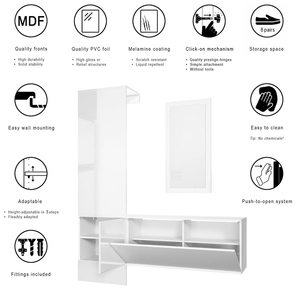Für eine besondere Eleganz sorgen die Fronten des Garderobensets, erhältlich in vielen verschiedenen Farbvarianten. Durch die Oberflächenbeschichtung der einzelnen Möbelstücke erhalten Sie besonders pflegeleichte Produkte. Für die Reinigung reicht ein leicht angefeuchtetes Tuch, um die wasserfesten Oberflächen angemessen zu reinigen.