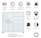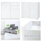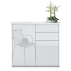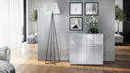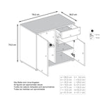 Ob als modernes Sideboard im Wohnzimmer, Kommodenschrank für's Schlafzimmer, Anrichte im Flur oder als Kommode im Kinderzimmer – die geräumige Kommode Milan präsentiert sich als praktisches Möbelstück mit modernem Design, hergestellt in Deutschland. Der Beistellschrank ist mit einer großen Tür, einer kleinen Tür und zwei leichtgängigen Schubladen ausgerüstet. Die Schubkästen verlaufen dank Laufschienen aus Metall nahezu geräuschlos und sorgen für eine leichte Handhabung. Hinter den Türen befinden sich jeweils zwei geräumige Fächer mit Einlegeboden. Die Türen und Schubladen sind mit unserem Push-to-Open-System ausgestattet. Eine Rückwand in Holzoptik aus Hartfaserplatten ist im Lieferumfang enthalten.