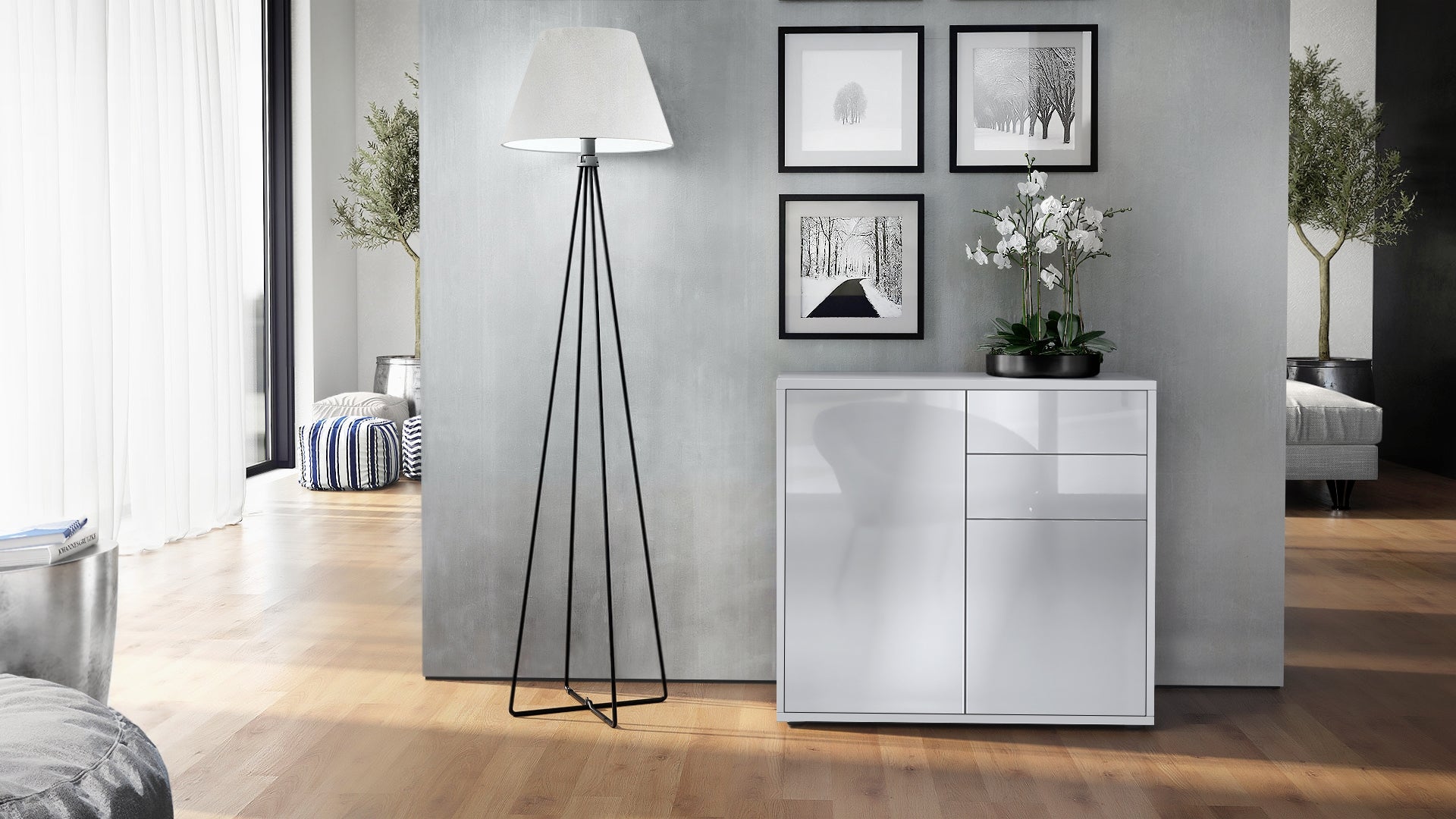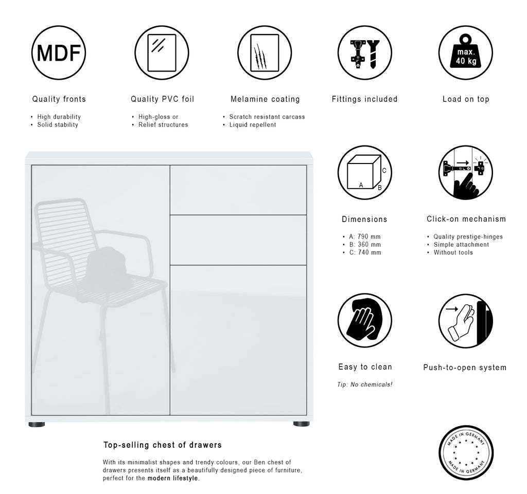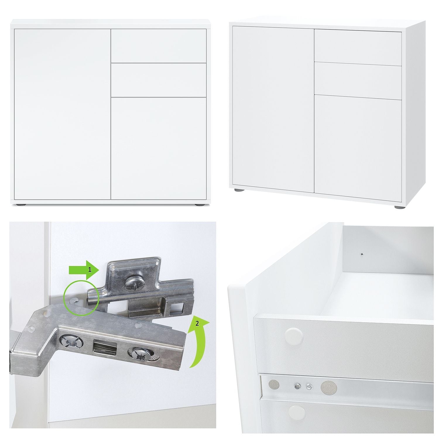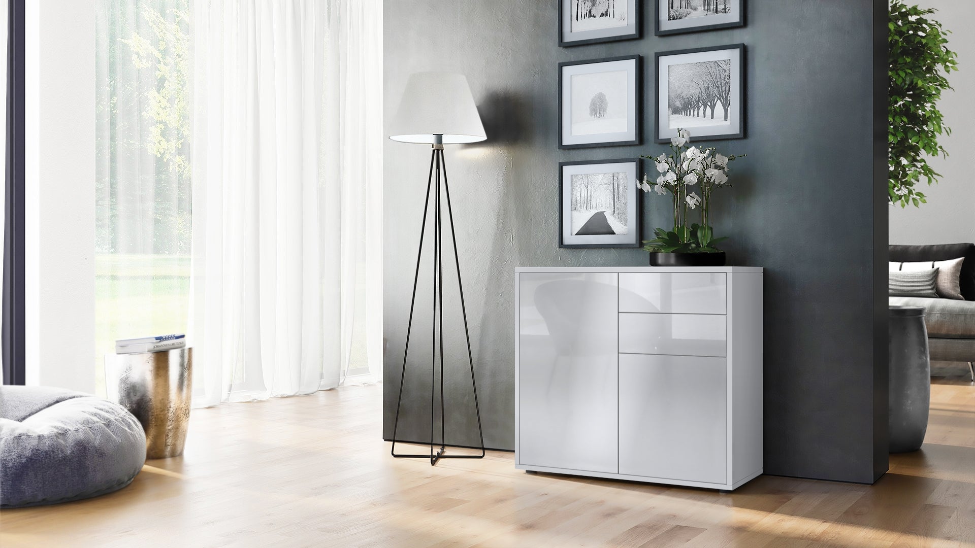 Durch das schlichte, moderne Design lässt sich die Kommode mit vielen verschiedenen Einrichtungsstilen kombinieren und sowohl als Wohnzimmerschrank, Kommode im Schlafzimmer oder als TV-Sideboard einsetzen. Für eine besondere Eleganz sorgen die Fronten der Türen- und Schubladenkommode, erhältlich in vielen verschiedenen Farbvarianten, die Ihnen eine Vielzahl an Kombinationsmöglichkeiten bieten. Durch die Oberflächenbeschichtung erhalten Sie ein besonders pflegeleichtes Produkt. Für die Reinigung können Sie auf Chemie verzichten - es reicht ein leicht angefeuchtetes Tuch, um die wasserfeste Oberfläche angemessen zu reinigen.