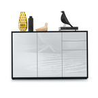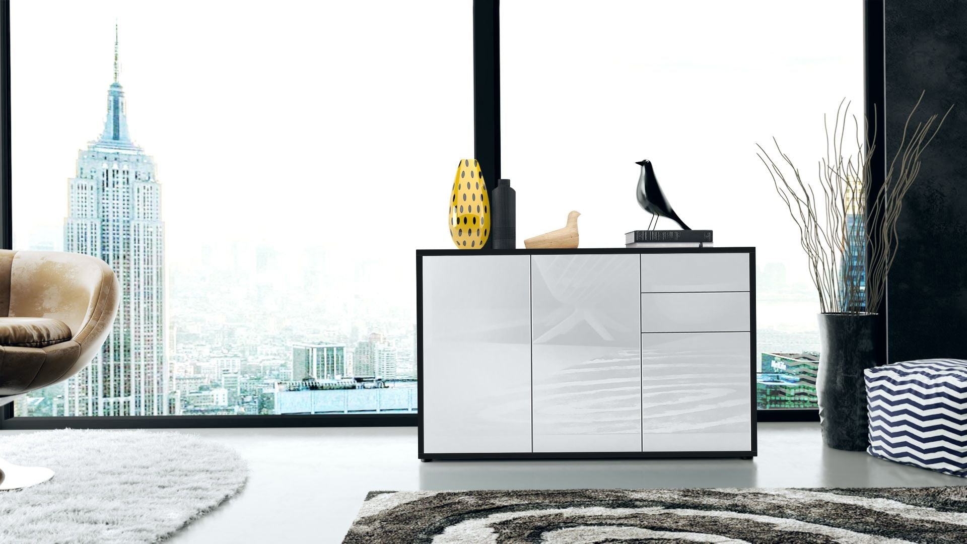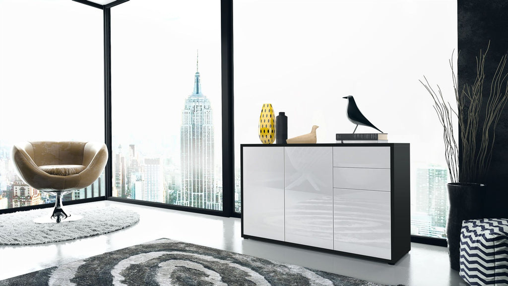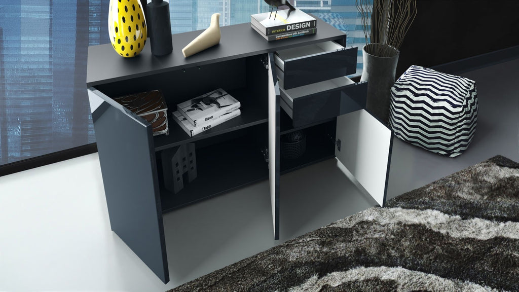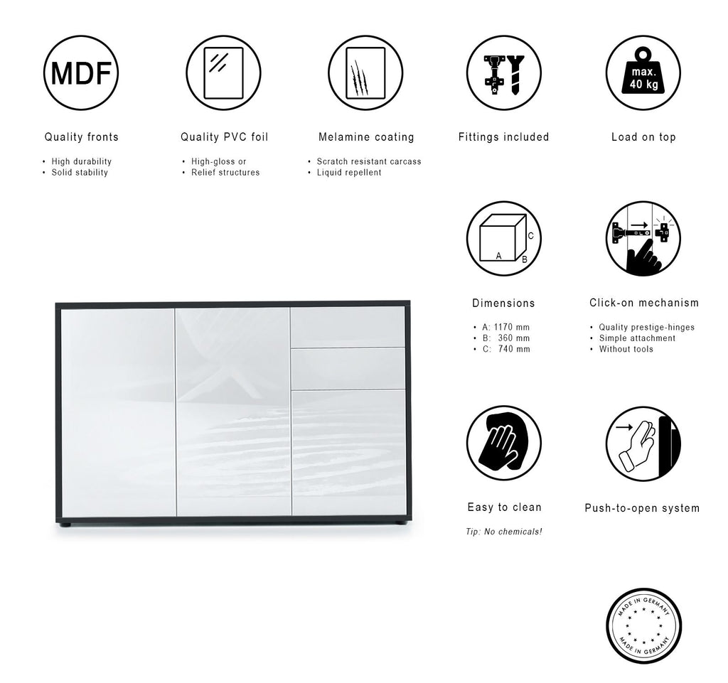 Durch das schlichte, moderne Design lässt sich die Kommode mit vielen verschiedenen Einrichtungsstilen kombinieren und sowohl als Wohnzimmerschrank, Kommode im Schlafzimmer oder als TV-Sideboard einsetzen. Für eine besondere Eleganz sorgen die Fronten der Türen- und Schubladenkommode, erhältlich in vielen verschiedenen Farbvarianten, die Ihnen eine Vielzahl an Kombinationsmöglichkeiten bieten. Durch die Oberflächenbeschichtung erhalten Sie ein besonders pflegeleichtes Produkt. Für die Reinigung können Sie auf Chemie verzichten - es reicht ein leicht angefeuchtetes Tuch, um die wasserfeste Oberfläche angemessen zu reinigen.