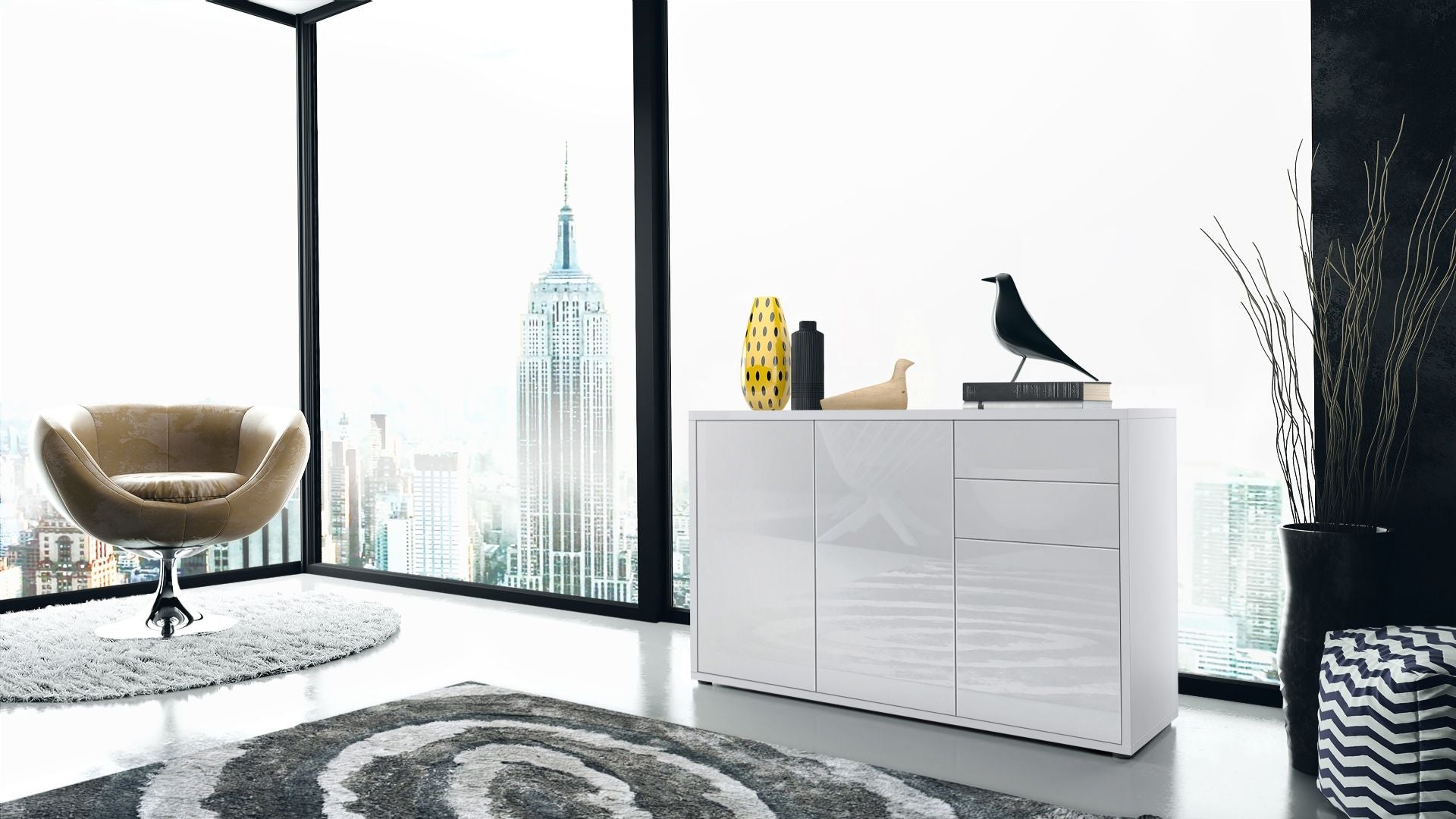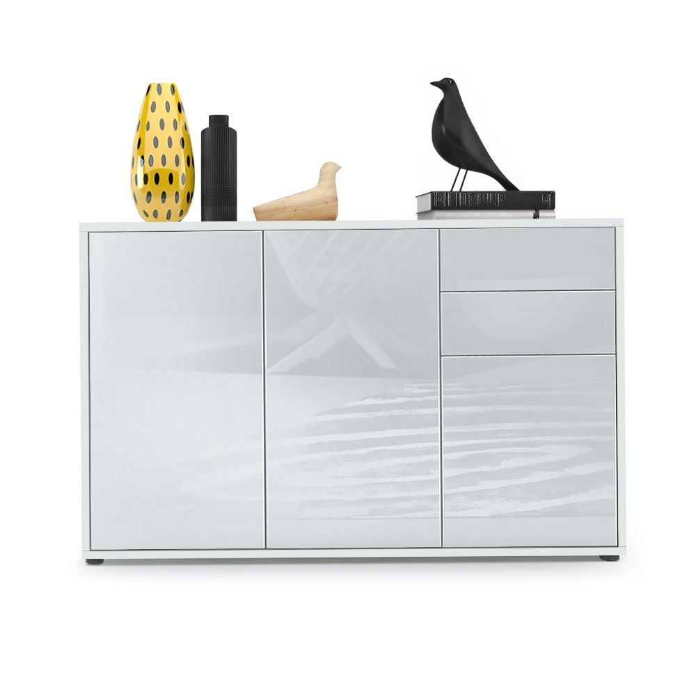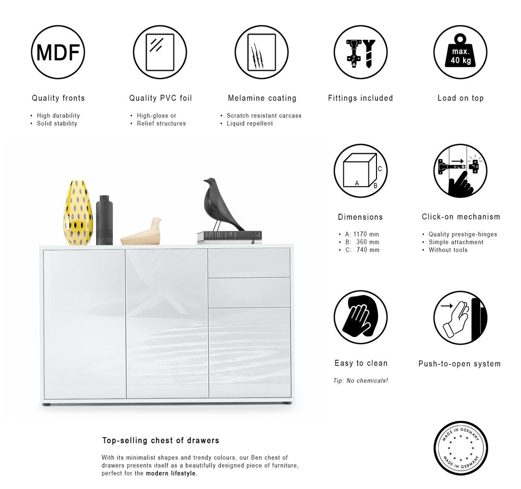 Durch das schlichte, moderne Design lässt sich die Kommode mit vielen verschiedenen Einrichtungsstilen kombinieren und sowohl als Wohnzimmerschrank, Kommode im Schlafzimmer oder als TV-Sideboard einsetzen. Für eine besondere Eleganz sorgen die Fronten der Türen- und Schubladenkommode, erhältlich in vielen verschiedenen Farbvarianten, die Ihnen eine Vielzahl an Kombinationsmöglichkeiten bieten. Durch die Oberflächenbeschichtung erhalten Sie ein besonders pflegeleichtes Produkt. Für die Reinigung können Sie auf Chemie verzichten - es reicht ein leicht angefeuchtetes Tuch, um die wasserfeste Oberfläche angemessen zu reinigen.