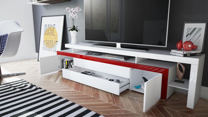 Das TV Board Plano ist ein absoluter Hingucker für Ihr Wohnzimmer. Es besteht aus zwei Türen, zwei Schubkästen und einem modernen Überbau mit offenen Fächern. Hinter den Türen befindet sich reichlich Stauraum für z.B. DVDs oder Bücher. Die Schubkästen, die sich mittig befinden, bieten zusätzlichen Platz für kleinere Dinge. Die offenen Fächer unter dem Überbau eignen sich hervorragend für Ihren Receiver oder Spielekonsolen.