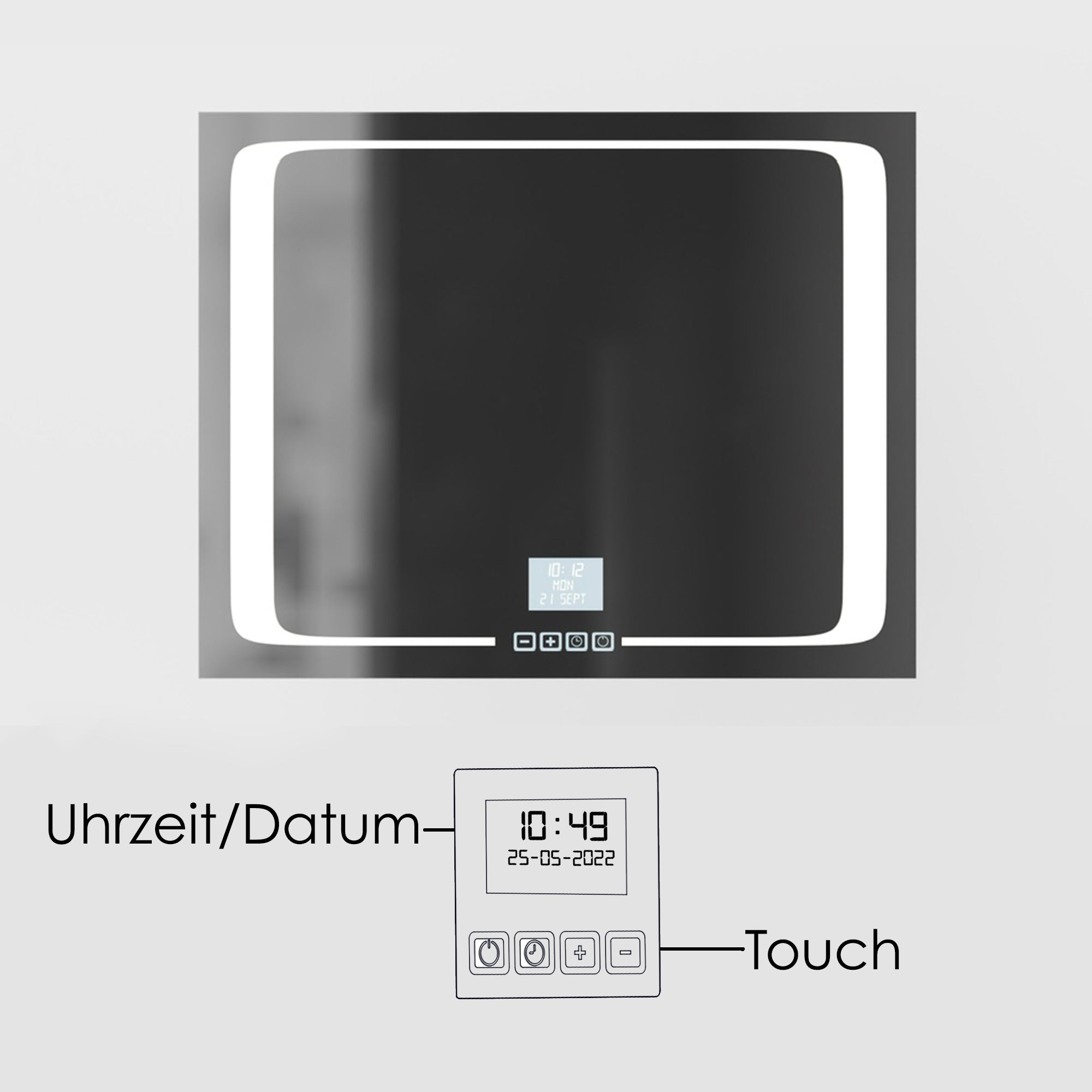 Optionaler LED-Spiegel – Modernes Touchfeld zur Steuerung von Beleuchtung, Uhrzeit- & Datumsanzeige.