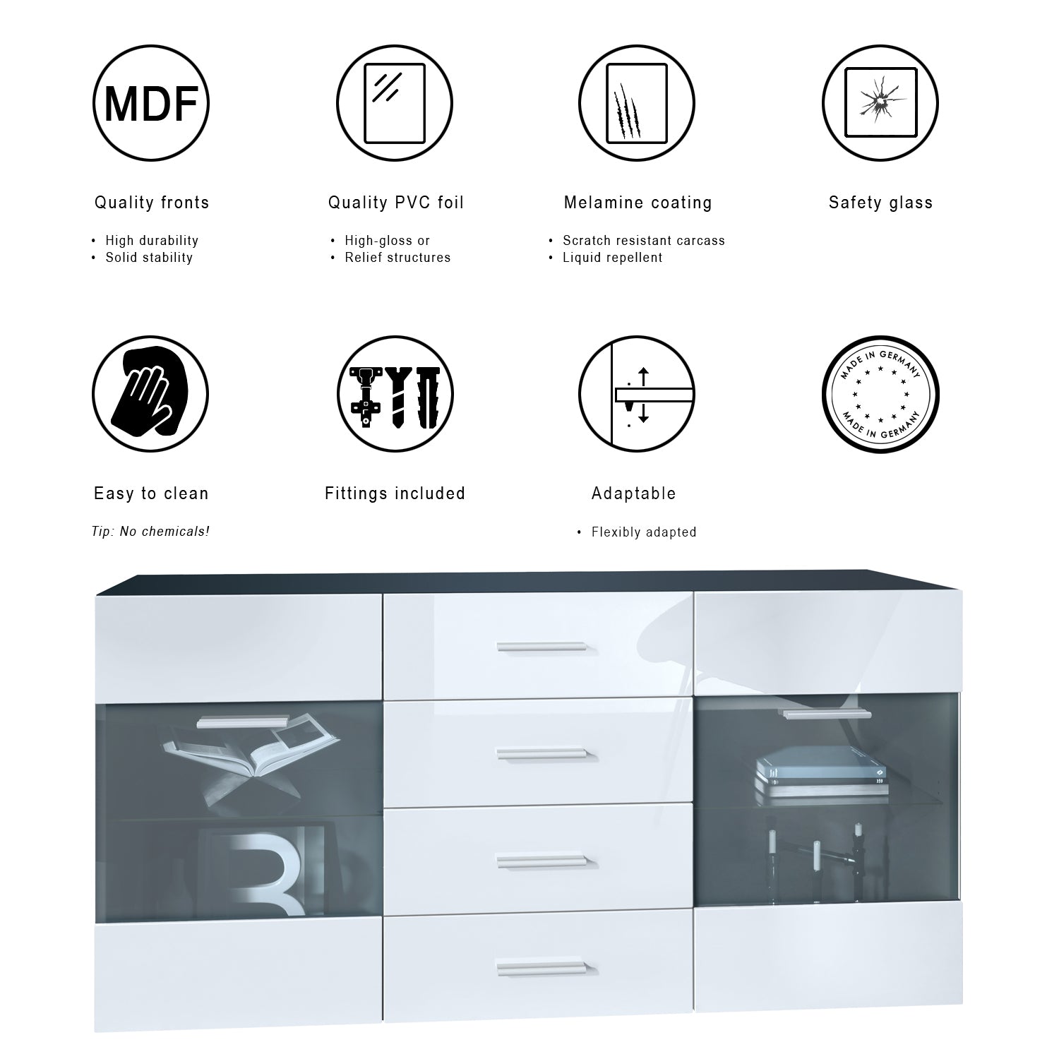 Das Sideboard Graz besticht durch hochwertig foliierte MDF-Fronten und einen stabilen Korpus aus Spanplatten mit Melaminbeschichtung. Es ist leicht zu pflegen und behält seinen glänzenden Look über lange Zeit. Mit erstklassiger Verarbeitung und Made in Germany können Sie sich auf eine hohe Qualität verlassen.