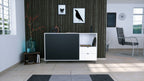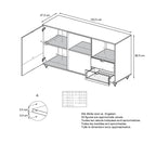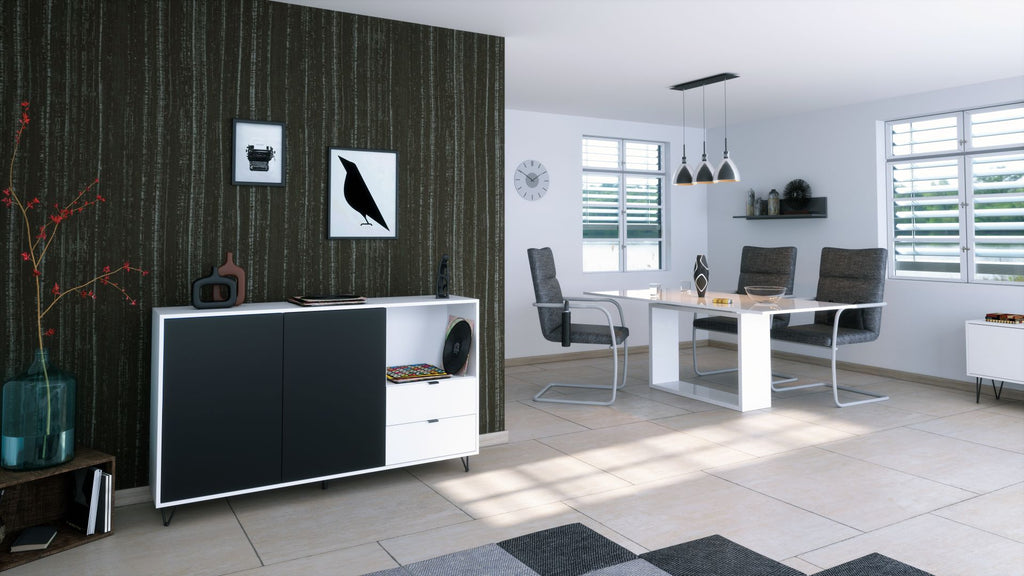 Hinter den zwei großen Türen mit Push-to-Open-Funktion befinden sich insgesamt vier geschlossene Fächer – perfekt zur Nutzung als Kommode, Schrank oder Aufbewahrungsschrank für Geschirr, Deko oder Haushaltsartikel. Auf der rechten Seite bietet ein offenes Fach Platz für Dekoelemente, Pflanzen oder Technik. Direkt darunter befinden sich zwei praktische Schubladen mit schwarzen Metallgriffen – ideal für Kleinteile, Besteck oder Dokumente.