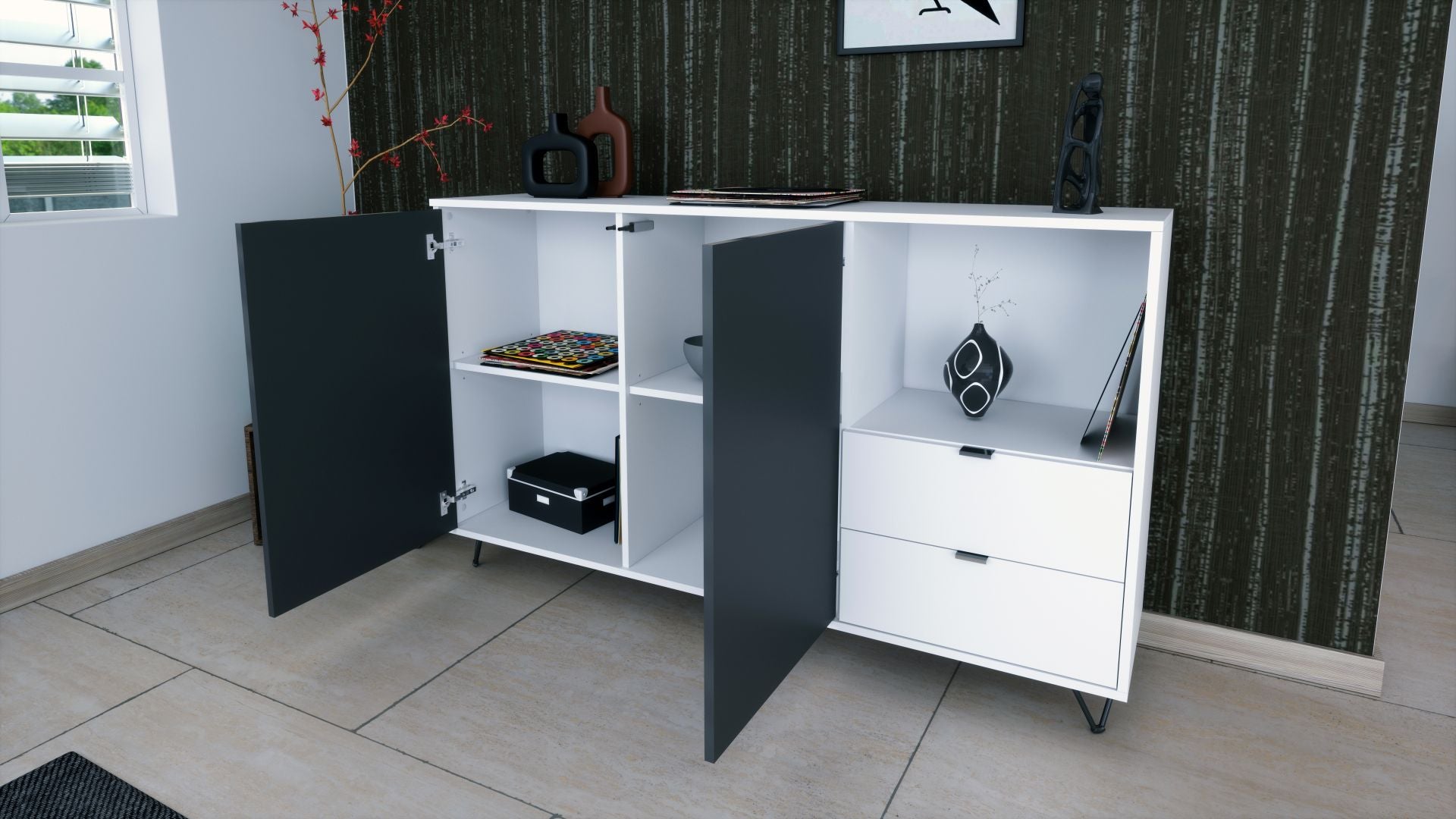 Das Mirano Sideboard vereint modernes Design mit cleverem Stauraum. Der Korpus in Weiß matt verleiht dem Möbelstück eine zeitlose, elegante Ausstrahlung. Schwarze Füße sorgen für Stabilität und setzen elegante Akzente. Die Frontfarbe ist individuell wählbar – ideal für Wohnzimmer, Schlafzimmer, Esszimmer oder Flur.