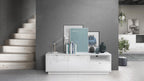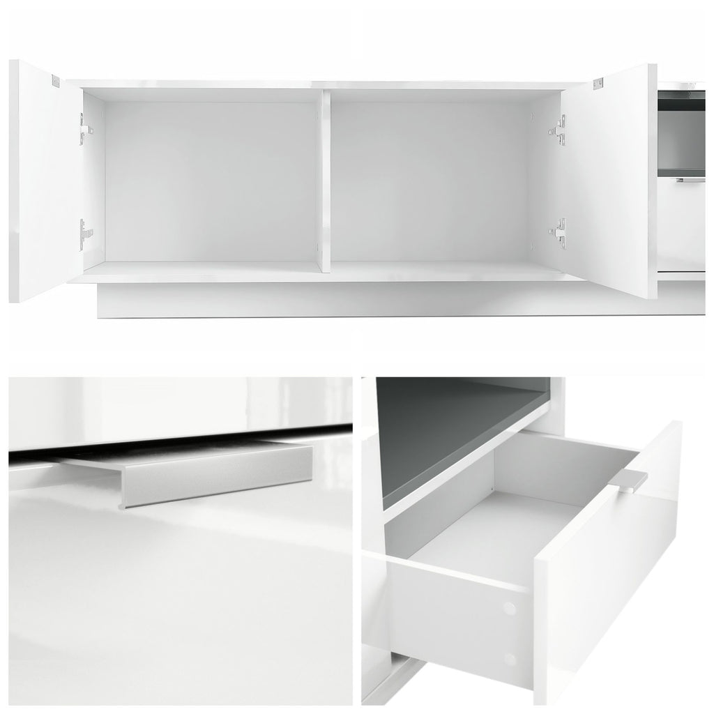 Der glänzende Korpus aus stabiler, melaminbeschichteter Spanplatte verleiht dem TV Board seine Robustheit. Ein farbiger Einsatz aus MDF setzt Deine individuelle Note, während die Türen mit Softclose-Scharnieren sanft schließen. Die Design-Griffe aus hochwertigem Aluminium verleihen dem Möbelstück eine edle Note. Perfekt abgestimmte gedämpfte Unterflurlaufschienen aus Metall sorgen für eine reibungslose Schubladenbewegung.