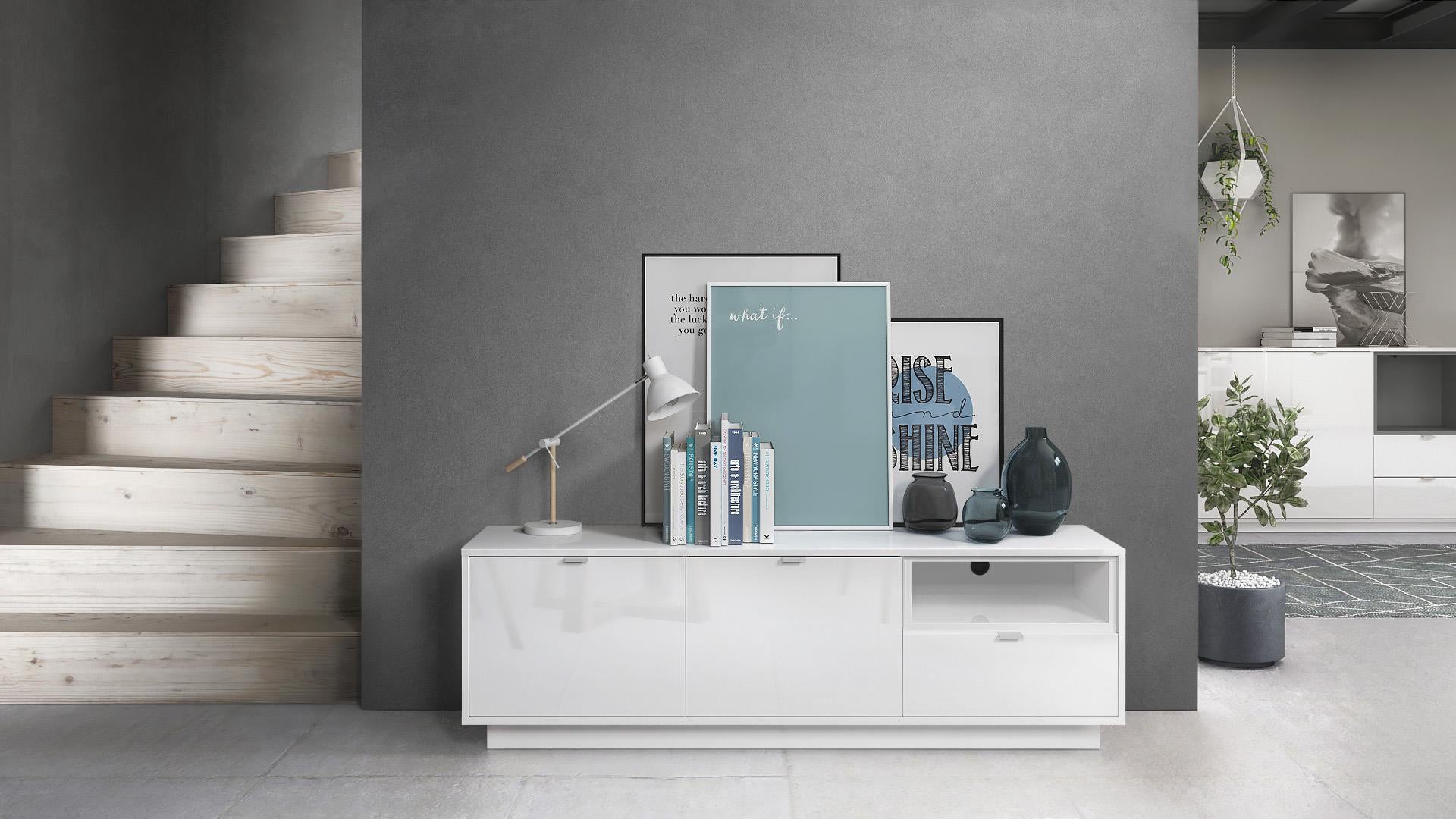 Unser TV Board ist mehr als nur ein Möbelstück – es ist Deine persönliche Stilbühne, die Dir Raum für Deine Ideen bietet. Hinter den beiden Türen und in den geräumigen Schubkästen verbirgt sich jede Menge Stauraum für Deine Alltagsgegenstände.